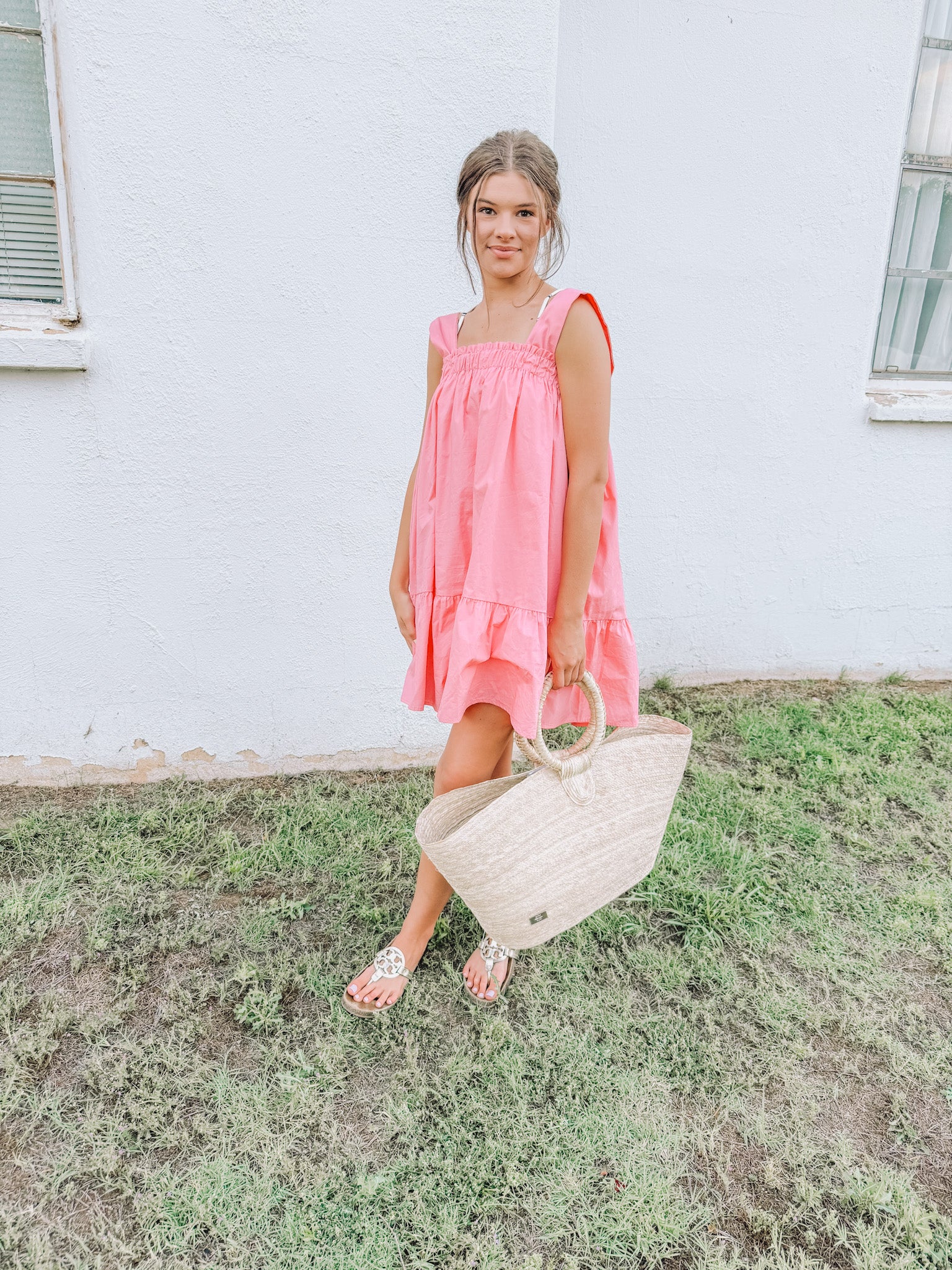 Pink sleeveless poplin babydoll dress. Fits true to size. Model is 5’ 5” wearing size small. Self/lining 100% cotton.